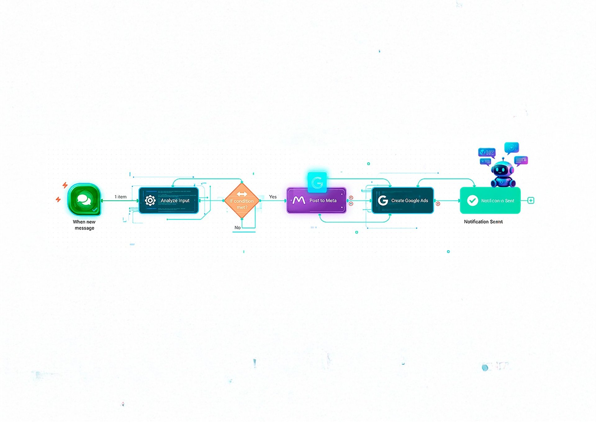 Diseñamos e implementamos sistemas automatizados que conectan tus plataformas de marketing, ventas y atención al cliente. Desde chatbots personalizados con IA, hasta flujos automáticos de respuesta, reportes y seguimiento de leads, creamos procesos que trabajan por ti. Menos tareas repetitivas, más tiempo para crecer estratégicamente.