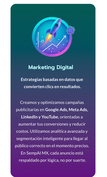Diseñamos estrategias que combinan campañas publicitarias efectivas, automatización inteligente y branding con propósito. En SempAI MX integramos tecnología e ideas creativas para hacer que tu negocio crezca, se posicione y conecte con las personas correctas.